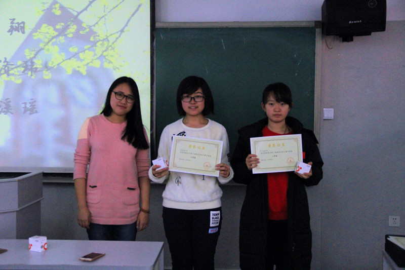 第十届运动康复系团总支员工会主席侯榕芳首先登台,为获得三等奖的侯溪瑶、杨济玮同学颁发了荣誉证书和三等奖奖品墨水,紧接着韩万滨老师为获得二等奖的阎雨柯、何佳玥同学颁发了荣誉证书和二等奖奖品钢笔,而后白玉茗老师又为一等奖获得者海涵同学颁发了荣誉证书和一等奖奖品200元。