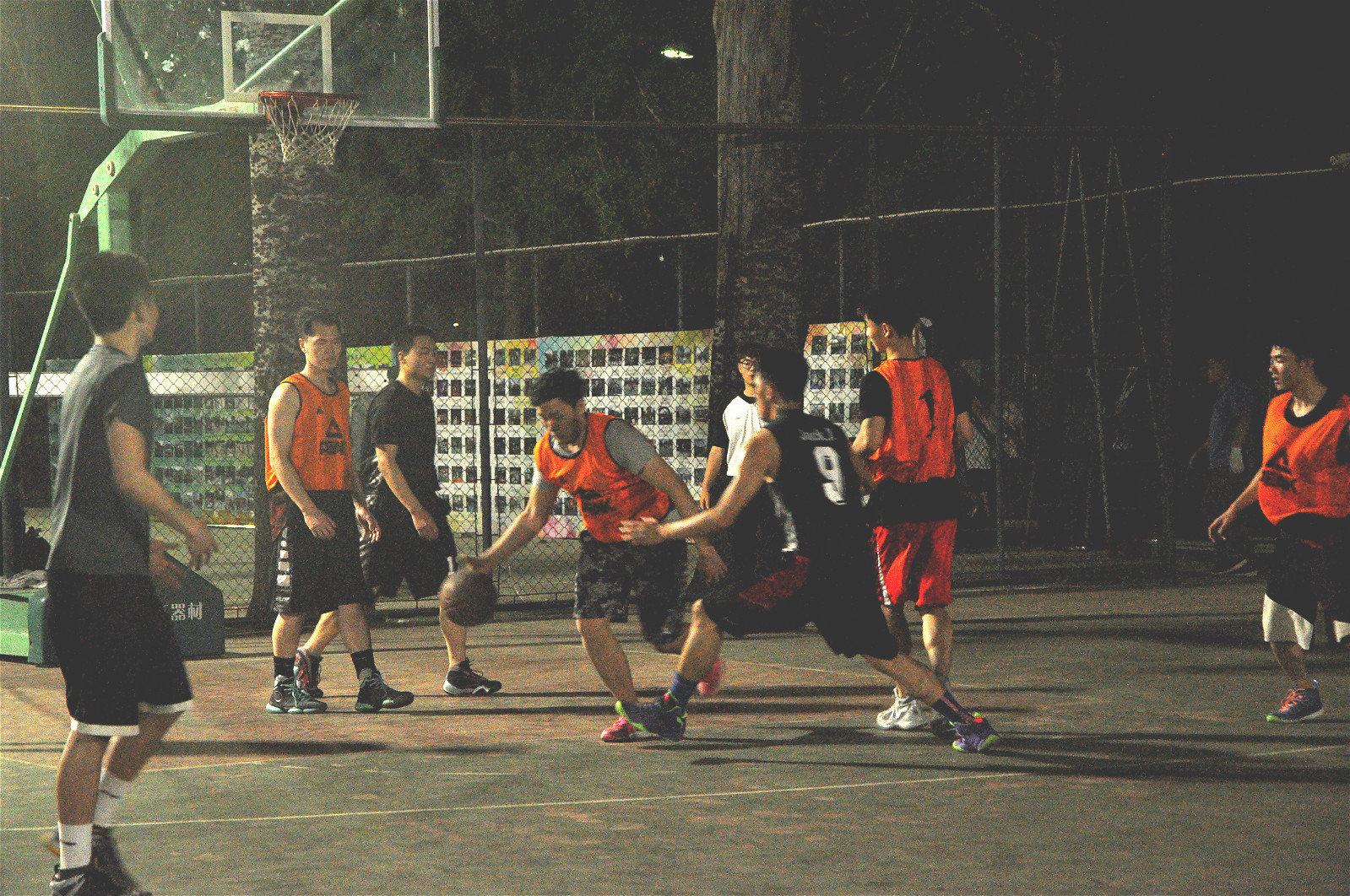 随着裁判将球抛向空中,11号场率先开始了比赛。首节开球,2013级气势如虹,队员高金硕内线率先得分,拿下本场第一个进球,但研究生球员们似乎并未受对方进球影响,队员刘杰与队友默契配合,命中一记漂亮的三分球。随后,两队进行了激烈的对抗,比分交替领先。第一节结束,比分14:18,研究生暂时领先。球员们稍事休息,第二节比赛开始。2013级队员们不甘落后,尽管起初手感不佳,但他们很快进行调整,打出了自己的节奏。此时,研究生球员同样表现突出,31号张喆安接连攻进数球,场上比分再度焦灼起来。第二节比分28:27,研究生仍以一分领先。第三节很快开始,场上气氛更加紧张,2013级球员疯狂反攻,史泽远与场上队友联防夹击,防守反击将比分逆转领先。随着第三节比赛倒计时结束,2013级男篮以41:38反超研究生男篮。最后一节比赛,研究生队伍中,刘杰五次犯规黯然离场,但他们依然紧咬比分,没有被2013级男篮拉开差距。场上双方队员使出浑身解数,紧密配合。最后关头,凭借2013级员史泽远出色的个人能力,将2013级队伍艰难带向胜利。当全场比赛结束哨声响起时,场上比分50-48,2013级险胜研究生。