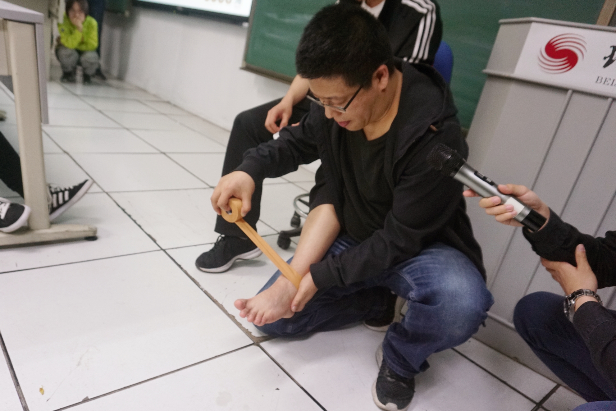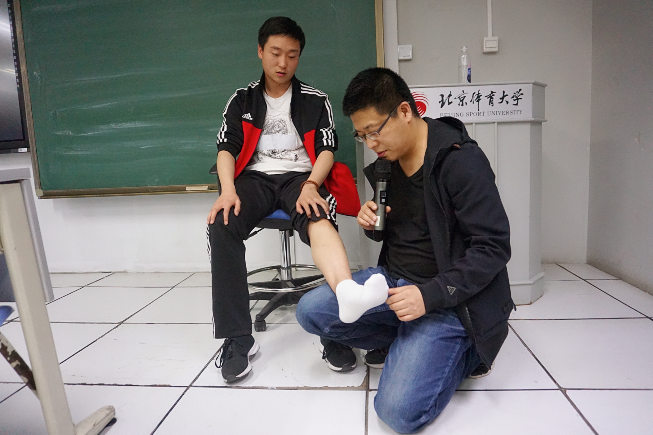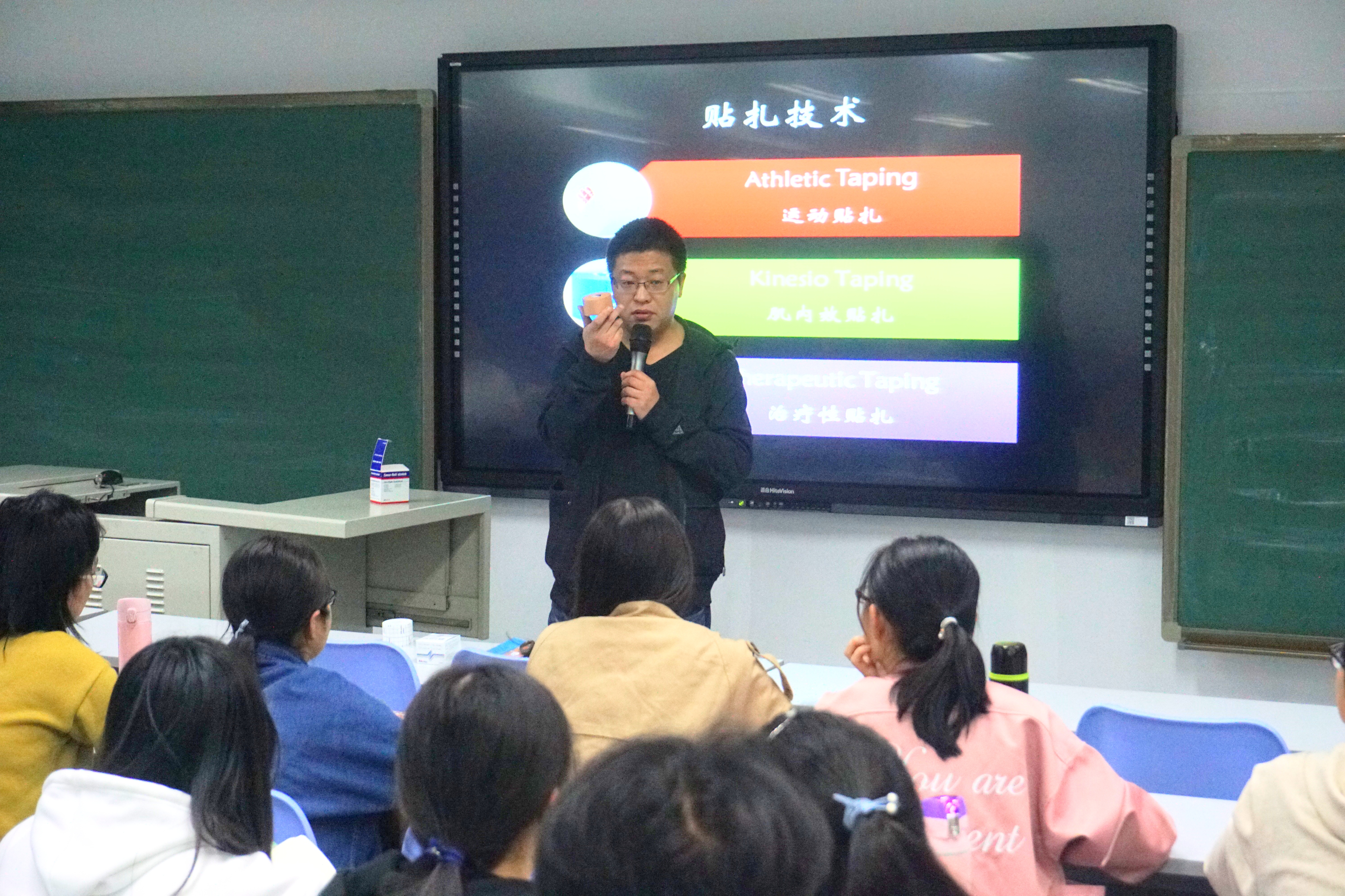 在马老师进行了简单的自我介绍之后,讲座正式开始。马老师针对贴扎技术的起源、肌贴的作用和种类、贴扎技术的分类、肌贴与生理系统的关系以及色彩效应等方面展开了介绍。在场的同学都认真倾听马老师的指导并不时进行记录。理论知识讲解结束后,马老师现场为同学们演示了他接诊病人的过程。在为受试者治疗的过程中,马老师一边通过触诊熟悉受试者的骨骼肌肉结构,一边询问其主诉感受,同时为同学们讲解接诊步骤、注意事项以及手法操作。同学们按捺不住求知欲,纷纷离开座位,站在老师周围认真观摩学习。教室里学术氛围浓厚,同学们不时提出疑惑,马老师也一一为同学们认真解答。最后,讲座在同学们的掌声中落下帷幕。