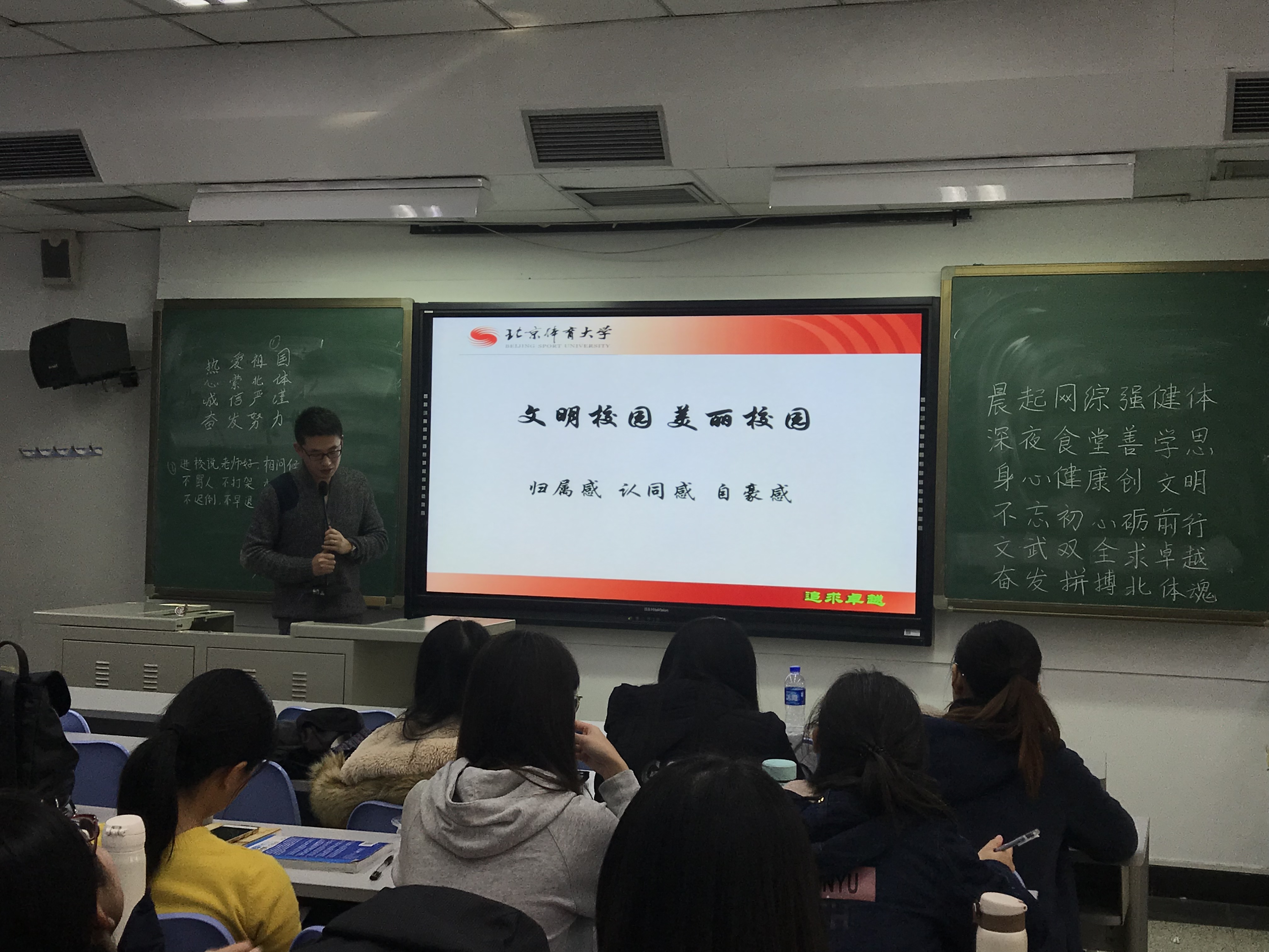 最后,年级长介绍了学工部发起的“文明北体,美丽北体”活动意义和要求,并对活动安排进行了详细的讲解,同时,播放了学工部周启迪副部长在2015级1班班会上的讲话录音,同学们对于“我们既要体现北体大的鲜明特色,也要体现时代赋予青年的鲜明特色”这句话体会颇深。通过讨论,提出了班级文明公约:“文武双全求卓越,奋发拼搏北体魂”,也为学校的宿舍、健身房、图书馆和餐饮大楼宣传标识创意设计提出了很好的建议。
