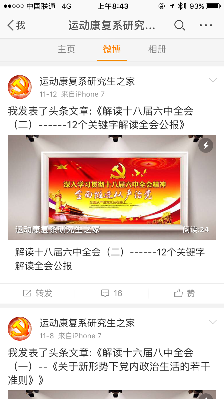 2016年11月7日-13日,康复系的研究生们展开了线上学习十八届六中全会精神的活动。由于研究生常有外出实习、实践的情况,不易做到集合在一起学习党的最新精神,所以我系研究生利用自己创立的微博公众平台发布相关的学习文章,便于向支部党员和积极分子们及时传达党的理论方针和政策文件,使我系研究生党员不论身在校内外都能及时了解所需信息。此方法收到了大家的一致好评。