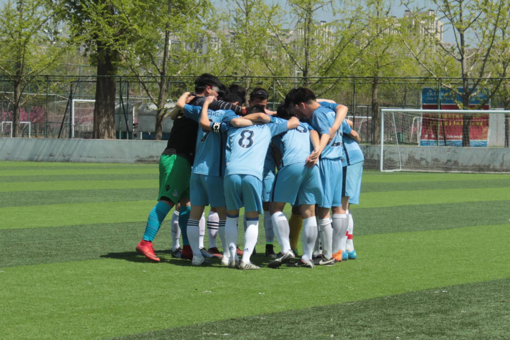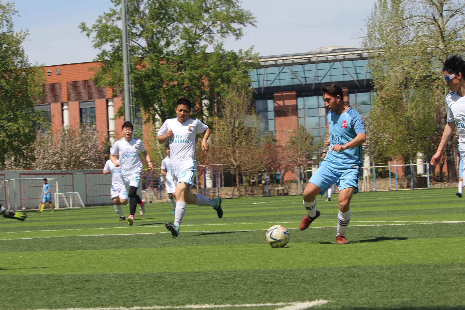 上半场开场不到3分钟,5号球员外力在禁区内接到32号王秋然球员精准传球,直接一记推射,足球应声入网。心理学院不甘落后,想追赶比分,5分30秒心理学院球员小角度打门,皮球被13号门将张阳朔没收。12分钟左右,王秋然再次和9号球员张宁打出精彩配合,王秋然从中场长传地滚球给右边路的张宁,张宁果断铲球射门,又快又狠!比分拉开至2:0。
