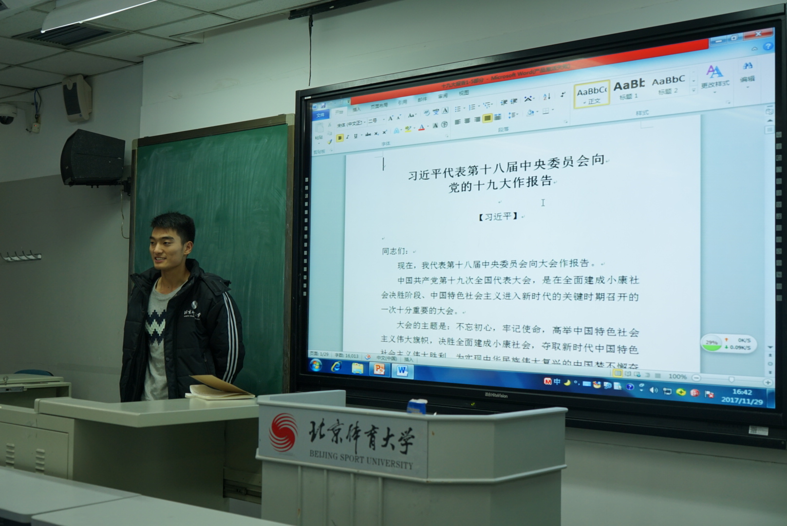 11月29日下午16:30在教学楼215教室,公司本科2017级举办了十九大报告学习分享会暨“文明北体,美丽北体”主题宣讲讨论会。2017级全体本科生参加,大会由辅导员王立娟老师主持。