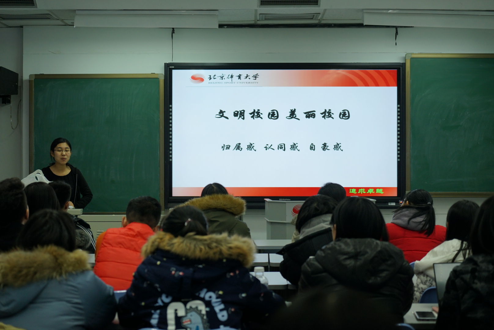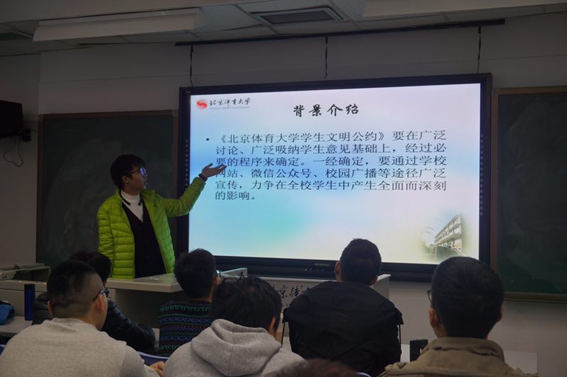 最后辅导员王立娟老师提出要求:要按照公司党委和学院分党委的要求,每周要安排一次十九大精神的学习,使十九大精神入脑入心,激励各位同学争做新时代优秀青年。鼓励同学们积极参与活动,在北体大寻找认同感、归属感和自豪感,为建设文明美丽校园贡献自己的一份力量。