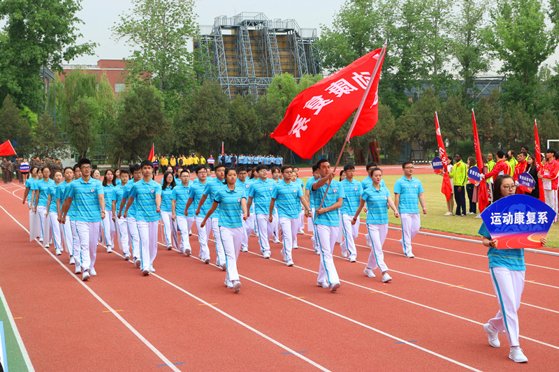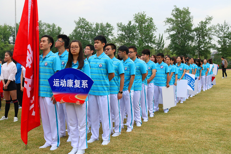 上午八点整,入场式正式开始。由各个院系的运动员组成的方阵依次经过主席台,向校领导展示自己院系的风采。我系方阵由48名同学组成,他们身着清爽的蓝白色服装,喊着嘹亮的口号,变换着整齐的队形,走到主席台前。同学们个个精神焕发,脚步坚定有力,口号整齐洪亮。“斗志昂扬 拼搏自强 追求卓越 康复最强”的口号喊出了我们追求的目标,也喊出了我们系参与运动会的热情。我系方阵同学的精彩表现引来主席台各位领导的阵阵掌声。