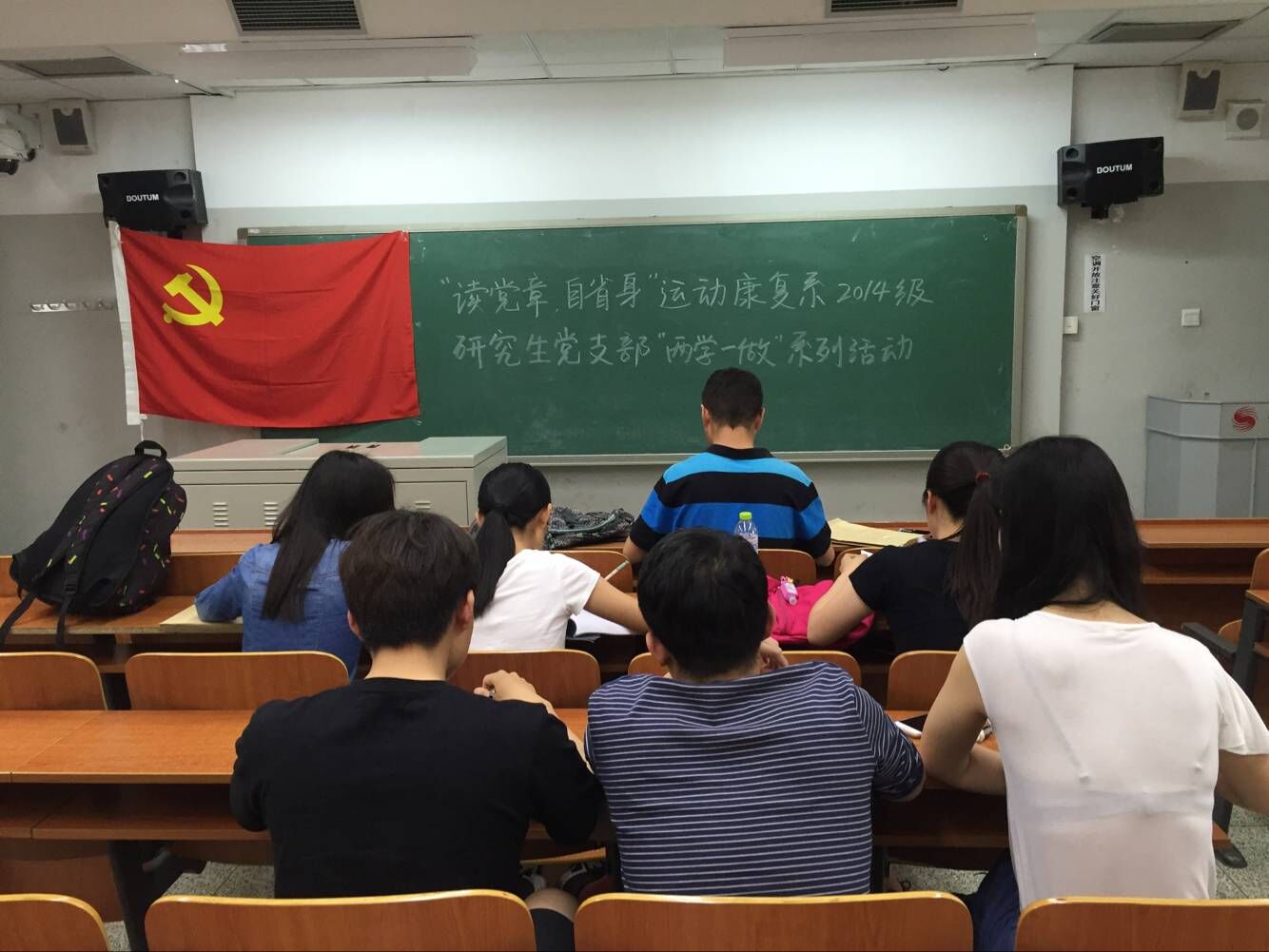 按照中央提出的学习党章党规,学习系列讲话,做合格党员的“两学一做”要求,根据公司党委组织部的统一部署和我系党总支的具体实施计划,2014级研究生党支部于2016年5月25日下午举行了以“读党章,自省身”为主题的 “两学一做”学习教育活动。研究生辅导员杨之慧老师主持会议,全体在公司党员出席会议。
