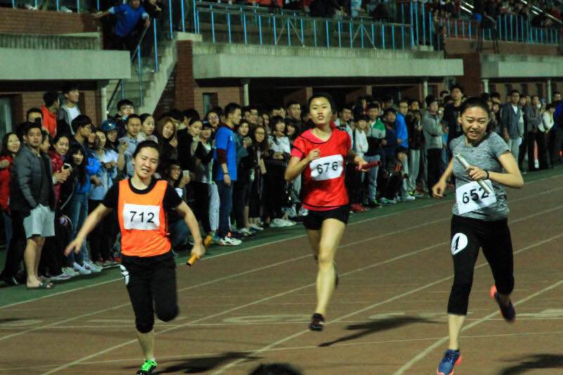 2016年4月20日星期三晚7点56分,我系运动员在女子4×100m决赛中以1:00.12的成绩荣获第三名。本次女子接力是由13级的李豪婧,14级的李虹莹、冯月和15级的王丽娜四人组队出赛。