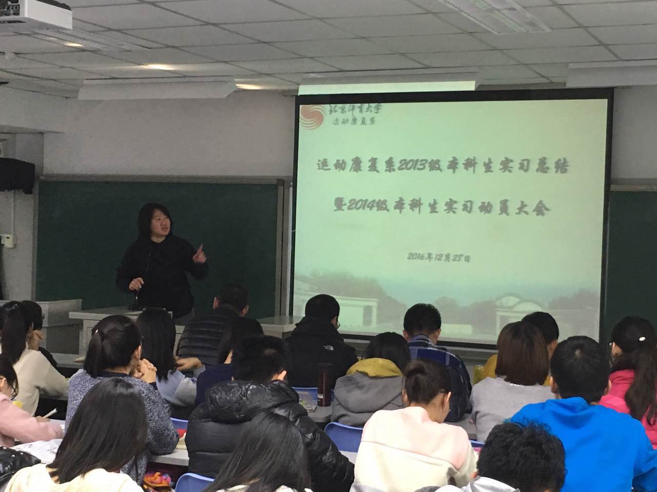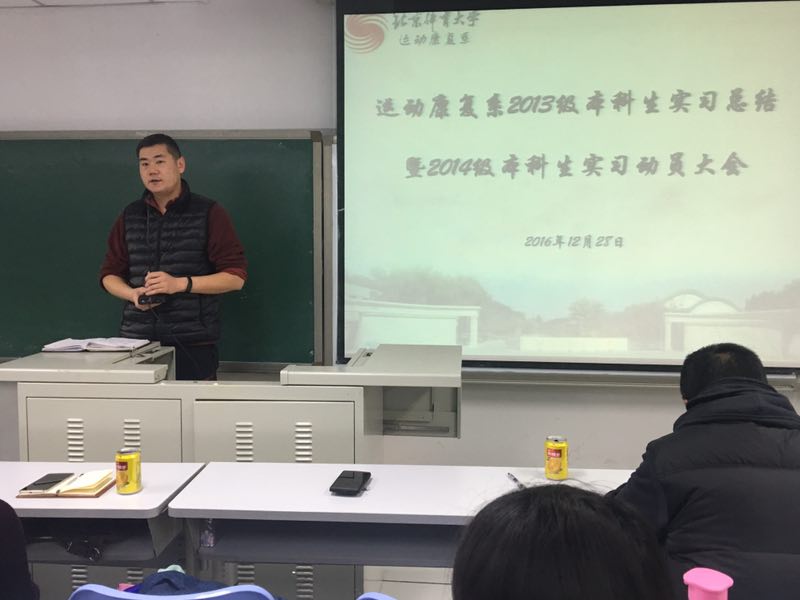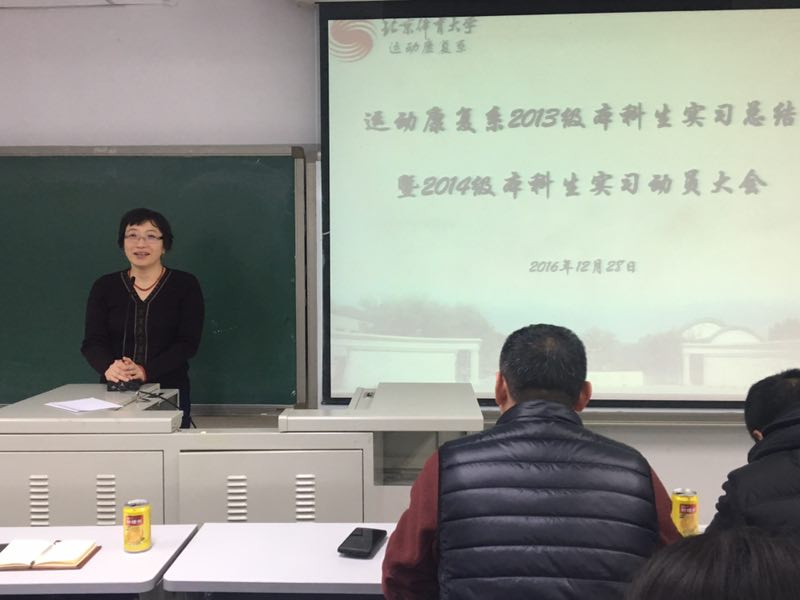 2016年12月28日星期三上午10点,我系2013级本科生实习总结暨2014级本科生实习动员大会在教学楼212教室举行。本次大会由运动康复系团总支书记、2013、2015级辅导员白玉茗老师主持。出席本次会议的有:运动康复系党总支书记苍海;运动康复系副主任矫玮;运动康复教研室主任高颀;运动康复教研室支部书记张恩铭;运动康复系教师白震民、侯世伦、黄鹏、阮槟、刘东森;运动康复系2014、2016级辅导员韩万滨;望京医院王刚医生;2013级实习代表以及2014级全体同学。