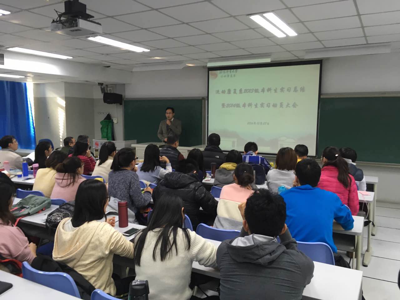 在实习汇报结束后,苍书记、矫老师分别对即将实习的2014级同学们进行了动员与期望。苍书记提出要在思想上高度重视,服从安排。要求同学们养成好的工作习惯,谦虚守纪,严格自律。希望每一名同学都珍惜实习机会,提前准备,认真学习,把握住这个机会。最后,向同学们表达了高度的期望与祝福,并提醒同学们注意安全。