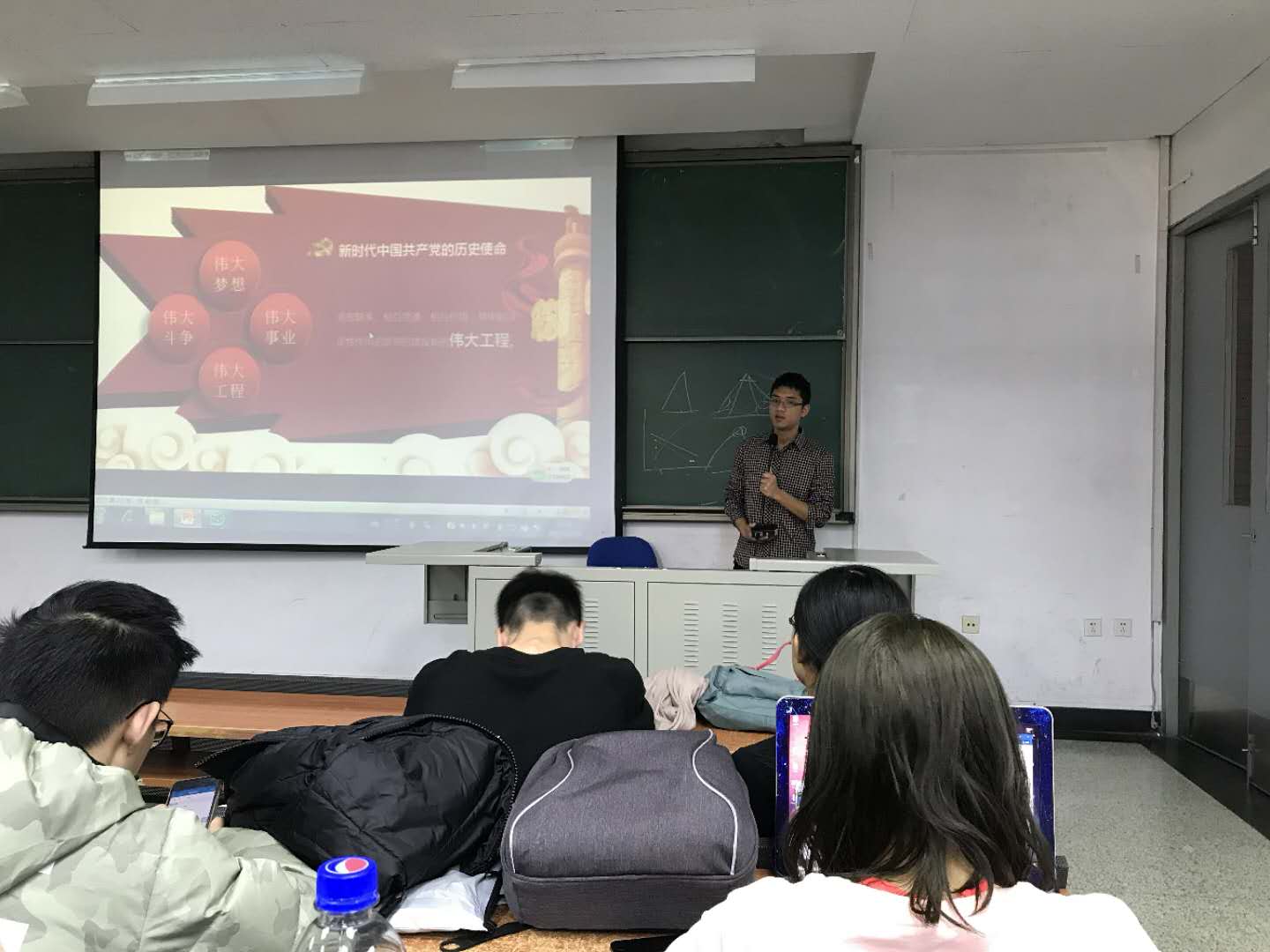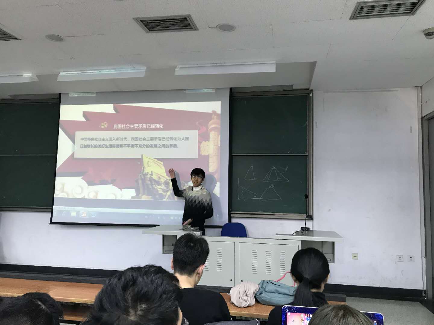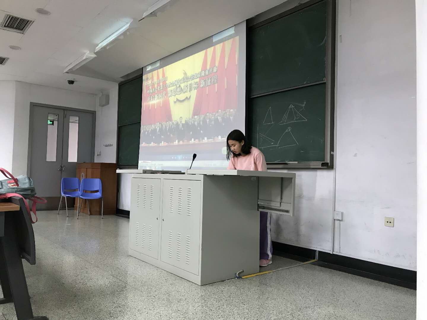 团支书刘馨淼带领大家学习了十九大的主要内容及其重要意义,同学们通过观看视频对“中国特色社会主义进入了新时代”这一板块进行了深入的学习;学习委员胡央带领大家学习了习近平新时代中国特色社会主义思想,新时代中国共产党的历史使命及新时代的基本方略;班长宋玉博带领大家学习了社会主要矛盾,说明了我国社会主要矛盾的转化,并且对“开启新征程”进行解读。