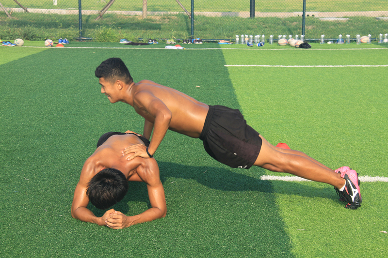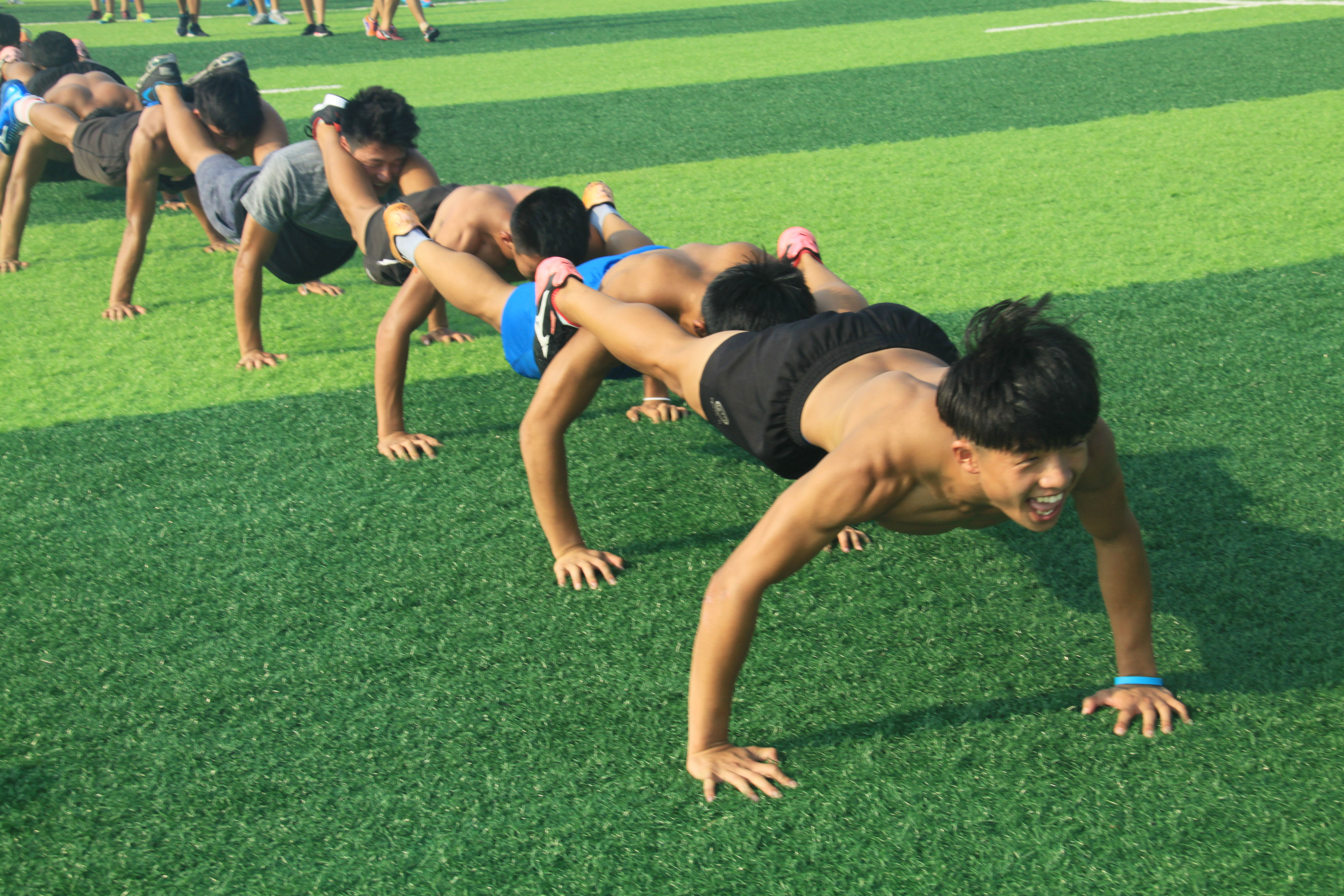 经过充分的热身后,朱广新同学带领队员们开始了正式的体能训练。首先,他向队员们示范了灵敏素质的训练方法,以此帮助他们在橄榄球比赛的实际对抗中能够快速进行攻防转换。然后他又带领运动员们练习了多组变向折返跑,模拟了橄榄球比赛的进攻模式,并锻炼了队员们的耐力素质。之后是重要的核心训练,队员们进行了多组腹桥、侧桥、背桥的训练,虽然气温逐渐升高,长时间的训练使队员们体力有些下降,但是他们依旧咬紧牙关坚持了下来。训练末尾阶段,大家进行了一个团队俯卧撑小挑战,大家互相鼓励,配合默契,顺利完成了今天的所有训练任务。