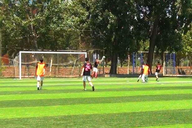 比赛第一节时,双方就开始了激烈的对攻,身着橙色球衣队凭借着前锋张宁的速度优势和梁孝天在中场的穿针引线打出了许多有威胁的进攻。在比赛开始进行到第十分钟时,张宁接到黄灿之的直塞,在小禁区右侧边缘一脚劲射将球送入球门。之后的比赛双方场面也逐渐被打开。之后梁孝天队的一次进攻中,黄灿之一脚长传撕破对方防线,陶宇澄得球之后突破至禁区边缘面对门将时冷静将球传给门前的张宁,张宁在门线前停下了球,用头将地上的球顶进球门,引来一片喝彩。比赛时,韩导也来到了现场为同学们加油助威,比赛节奏也被推向了高潮。
