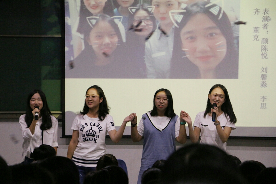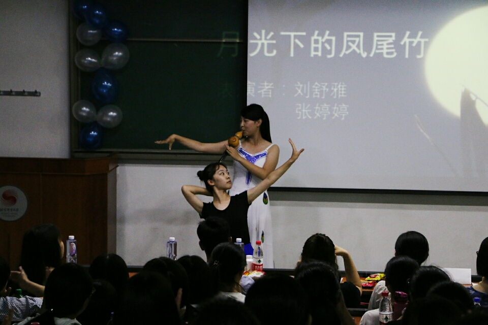 接下来是由2017级203寝室的6位女生集体带来的歌曲《爱情转移》,四位女生轮番演唱,音色各异,给人不一样的感受,另有两名女生给同学们带来了糖果惊喜,现场气氛持续升温;紧接着是节目《月光下的凤尾竹》,2017级刘舒雅伴着2017级张婷婷的葫芦丝乐声翩翩起舞,悠扬的葫芦丝乐声和优美的傣族舞蹈带大家领略了一番傣族的柔美风情。之后是由2017级的李毅婷、胡央、王珂祯、陈煜带来的小品《老同学》,小品虽然简短,但意蕴深长,妙趣横生,同学们忍不住笑得前仰后合。