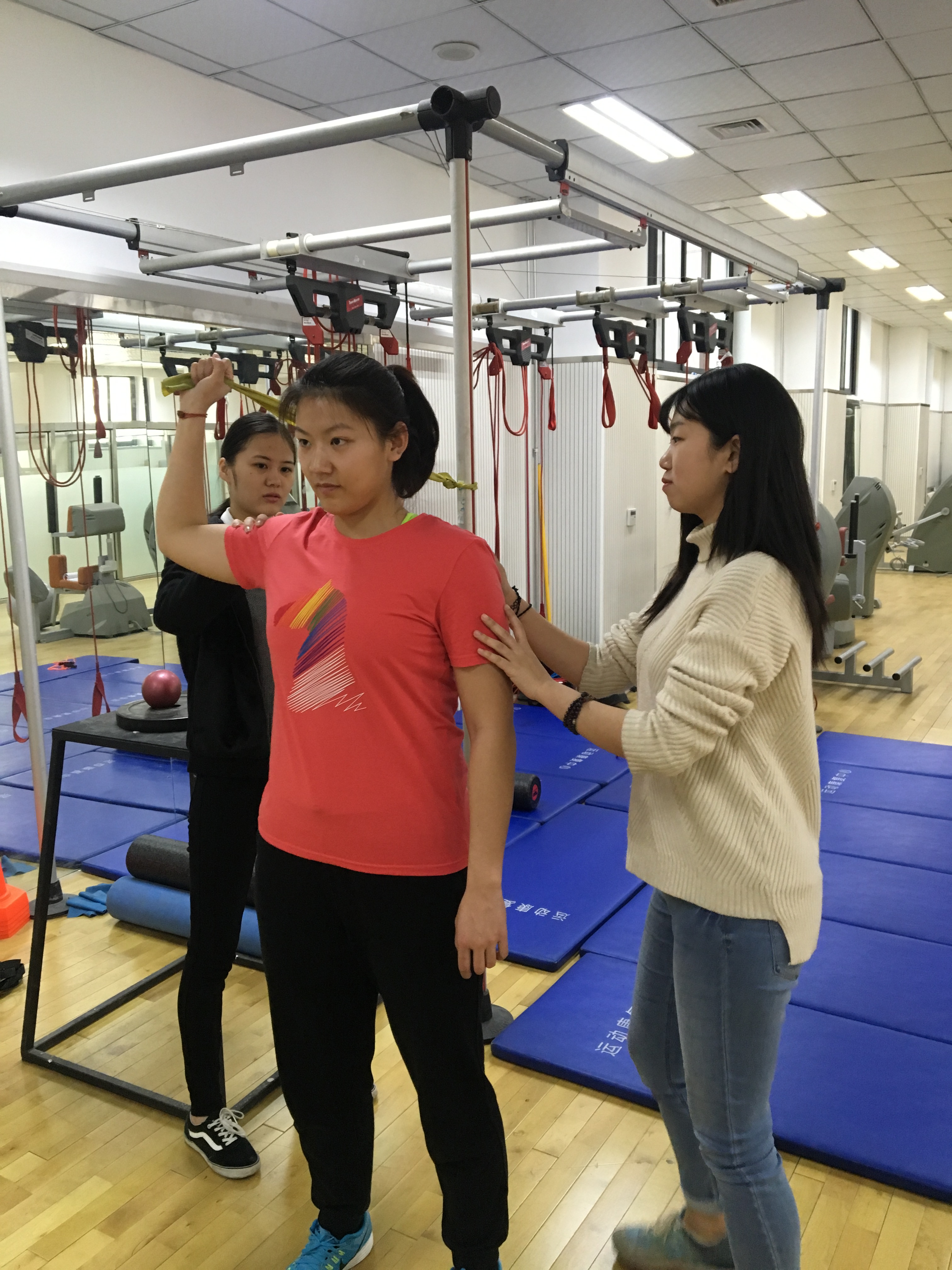 第一周的实习同学们有更多的时间来更好地适应康复大厅的工作环境,同学们都认真的做着笔记。接下来的一周,同学们的工作慢慢步入了正轨,谢老师给同学们布置了小作业,每周每个人要带一天的锻炼,目的是在学习知识的同时锻炼身体。同学们每天都干劲十足。