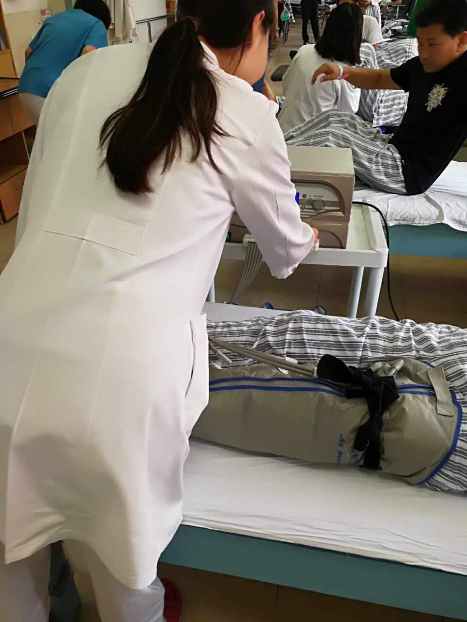 在这段医院的实习生活中,我们了解学习关于OT、ST的设备使用,更充分地练习PT治疗仪器的使用和手法治疗的操作,在老师的指导下对一些疾病的治疗有了很多的操作性的认识。提高了运动手法治疗的操作技术,如被动活动、按摩、神经肌肉促进技术、关节松动术、牵拉技术等,熟悉针对截瘫患者的斜床站立治疗技术,了解针对神经损伤患者的生物反馈治疗技术。学习MOTO、平衡训练、CPM、“血运”治疗的使用等。在北京大学第三附属医院的实习过程中,我们见到了很多典型病例和非典型性病例,实习的同学们利用休息时间讨论和研究各种病例的治疗方案,并向老师请教指导,扩宽我们的视野,提高我们的知识储备量和综合实践能力。从康复小讲堂中,学习和复习了临床知识,对肌肉的解剖结构、影像学知识、各种物理治疗方法有了更好的认识,收获了很多知识。