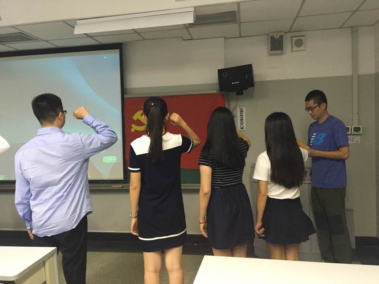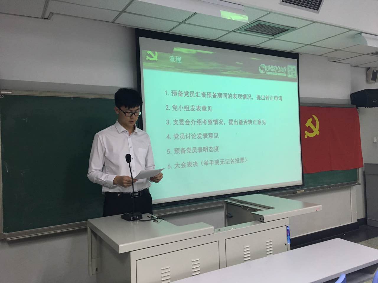 首先,韩老师主持支部预备党员转正大会。经过党支部一年来的考察,决定审议、讨论及表决柳玉鹏、郭明航、王馨莹、郑凯闻、郑炫五名同学的转正问题。首先预备党员提出转正申请,汇报思想情况,表明了态度和决心。在此之后,有表决权的党员进行表决,同意了以上五名同志的转正,希望以此为契机,进一步加强学习,努力起到一名中国共产党员的模范带头作用,为运动康复系贡献出自己的力量。