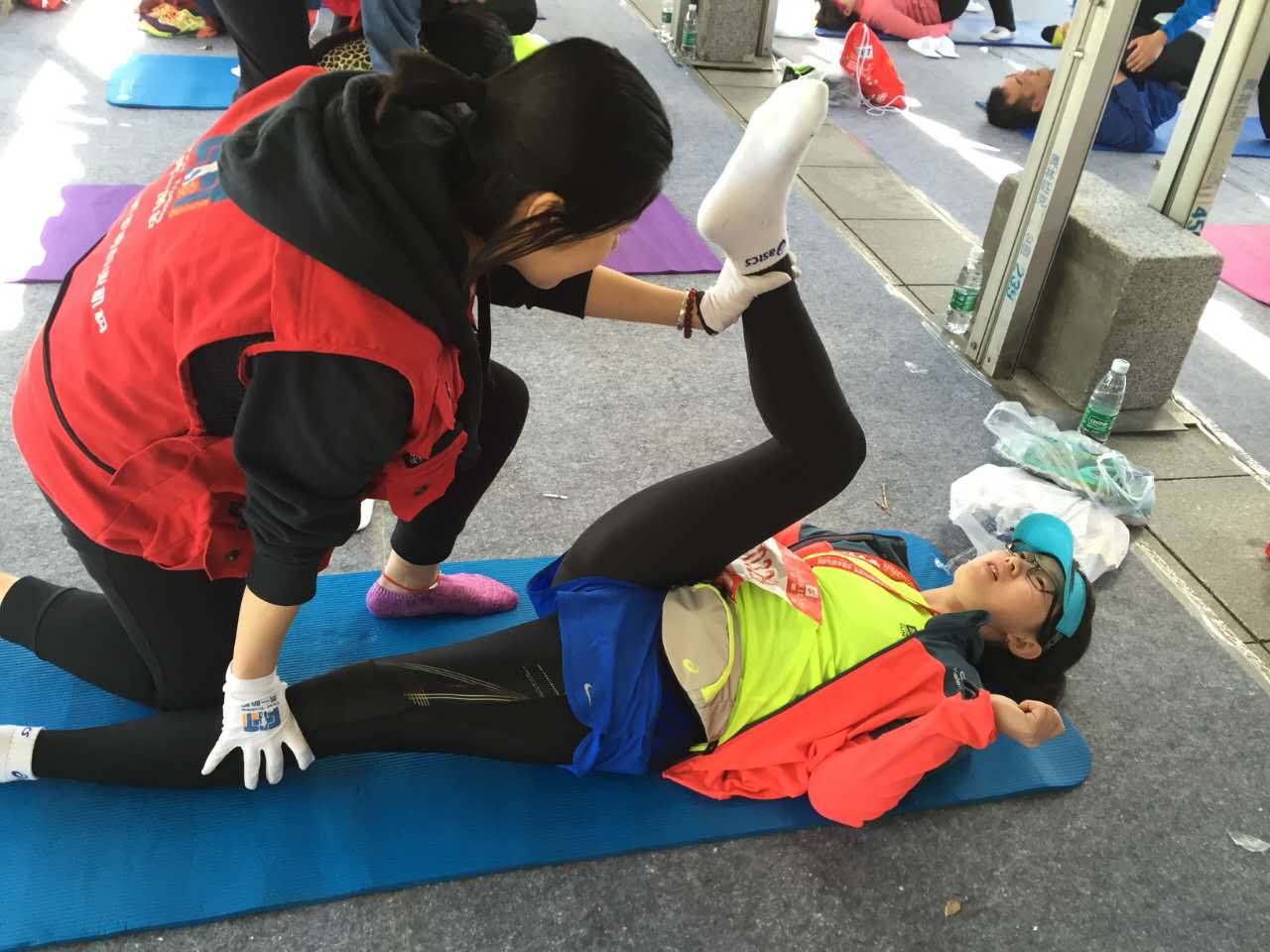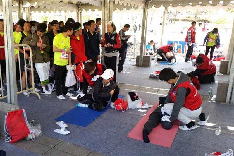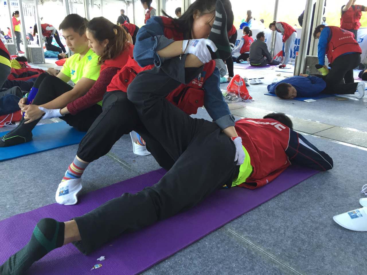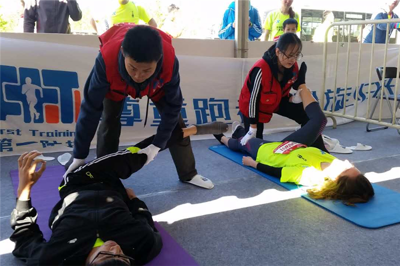 为了更专业更有效的为跑者提供赛后服务,星期六下午我们有幸邀请到国家体育总局的运动医学专家张乐伟老师为志愿者们进行了针对马拉松赛后的拉伸放松专项培训,取得了良好的教学效果,在让同学们巩固所学知识的同时也学到了一些新的知识。周日上午6点整,运动康复系志愿者们便集合完毕,乘坐大巴车来到了本次马拉松比赛的终点站--鸟巢。在到达后指定地点之后,大家便开始投入到紧张的前期准备中,同学们认真有序的完成搬桌子、装冰袋、放置瑜伽垫等多项任务,表现出了极高的工作热情。上午8点20分,志愿者们迎来了第一批完赛的运动员,运动员们在冰敷和适当的补给之后,开始接受由志愿者们帮助进行的被动拉伸放松。志愿者们被合理分配到各个工作环节,保证了整个活动的顺利进行。上午10点左右此次活动达到了工作高峰期,防护棚外排起了长长的队伍,志愿者们更是累的满头大汗。本次活动一直持续到中午11点半,长达5小时的大负荷工作使志愿者们都略感疲惫,但看到运动员们拉伸后舒心的笑容和真心的感谢,心里便感到十分满足。
