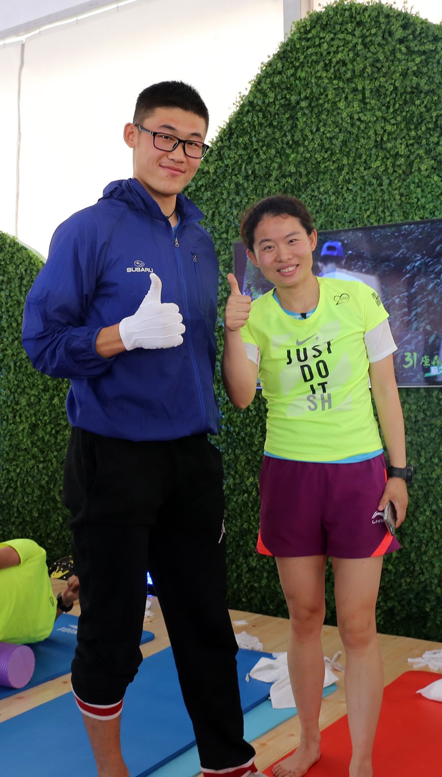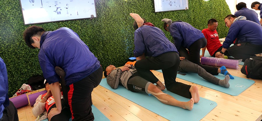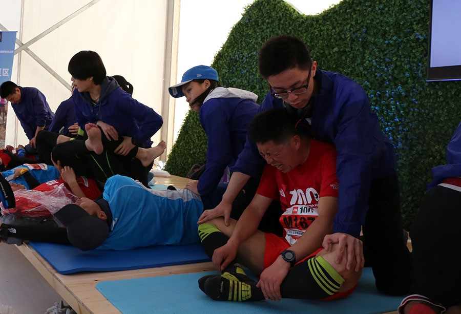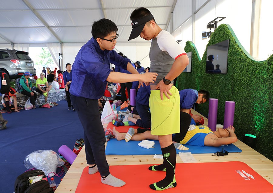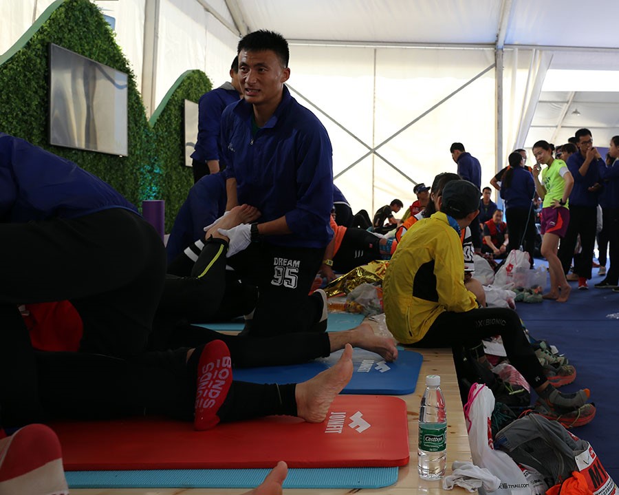 在到达后指定工作地点之后,所有志愿者便开始投入到紧张的前期准备中,同学们认真有序的完成搬物资、装冰袋、放置瑜伽垫和泡沫轴等多项任务,表现出了极高的工作热情。此次越野赛分为100公里、50公里、22公里三个组别,开始时间不一,从上岗开始志愿者们就不断迎来完赛的运动员,运动员们在冰敷和适当的补给之后,开始在志愿者们帮助下进行被动拉伸、放松。根据赛事活动各个工作环节的要求,志愿者们结合自身工作特点的,科学的统筹工作安排,保证了整个活动的顺利进行。上午9点左右此次活动便迎来了第一个工作高峰,每个瑜伽垫旁都排起了长长的队伍,志愿者们更是累的满头大汗。上午的活动一直持续到中午11点半,大负荷工作使志愿者们都略感疲惫,吃过午餐稍作调整,志愿者们又投入了紧张的工作。虽然工作强度很大,但看到运动员们拉伸后舒心的笑容和真心的感谢,心里便感到十分满足。