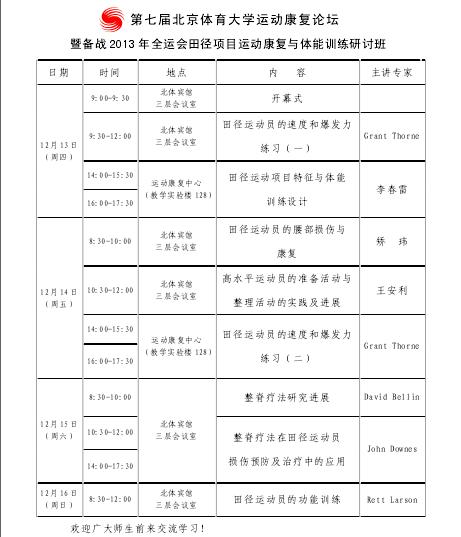 地点:北体宾馆(小白楼)三层会议室、运动康复中心(教学实验楼128);(详见课程安排)