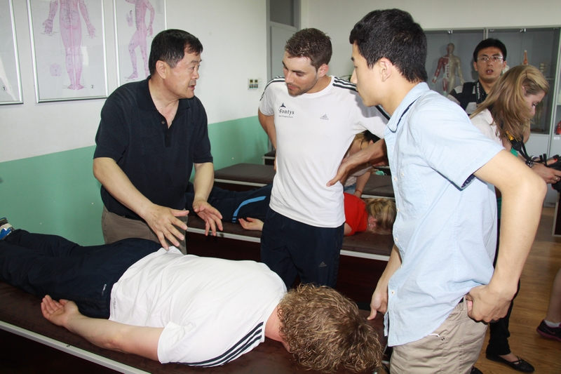 王安利主任首先代表bw必威西汉姆联官网运动康复系全体师生对访问团的到来表示了热烈的欢迎。本次交流会的主题是Chinese Massage——中式按摩,在接下来的一个多小时中,王安利主任对中式按摩的文化背景、分类等几个方面的问题进行了详细介绍,并着重对按摩手法进行了讲解和示范。在场的同学们都摩拳擦掌、跃跃欲试,从荷兰远道而来的同学们更是个个“玩”得不亦乐乎。