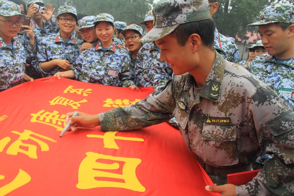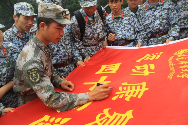 汇演结束也意味着离别的时刻即将到来,新生们用泪水将不舍表达,我系的同学们纷纷在连旗上写下各自的联系方式,赠予这12天来日日陪伴新生们的教官们,希望可以将这份珍贵的情谊珍藏。