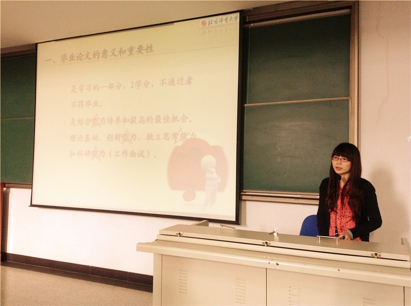 然后,孙恺羚老师就论文工作开展的具体时间安排、内容格式要求向大家进行详细介绍,包括11月份中期检查的要求、重要文献的书写格式以及三线表的运用。同时,孙老师提醒大家关注自己的学分问题,必修课程的不及格情况、选修任选的学分情况以及学术类学分的情况等都是需要未雨绸缪、提前准备的。