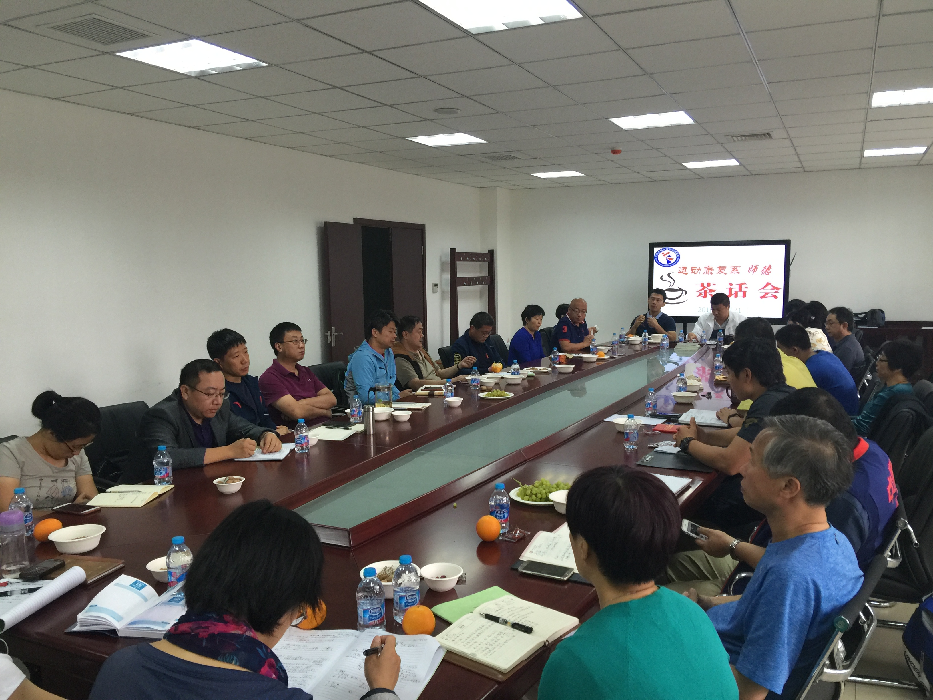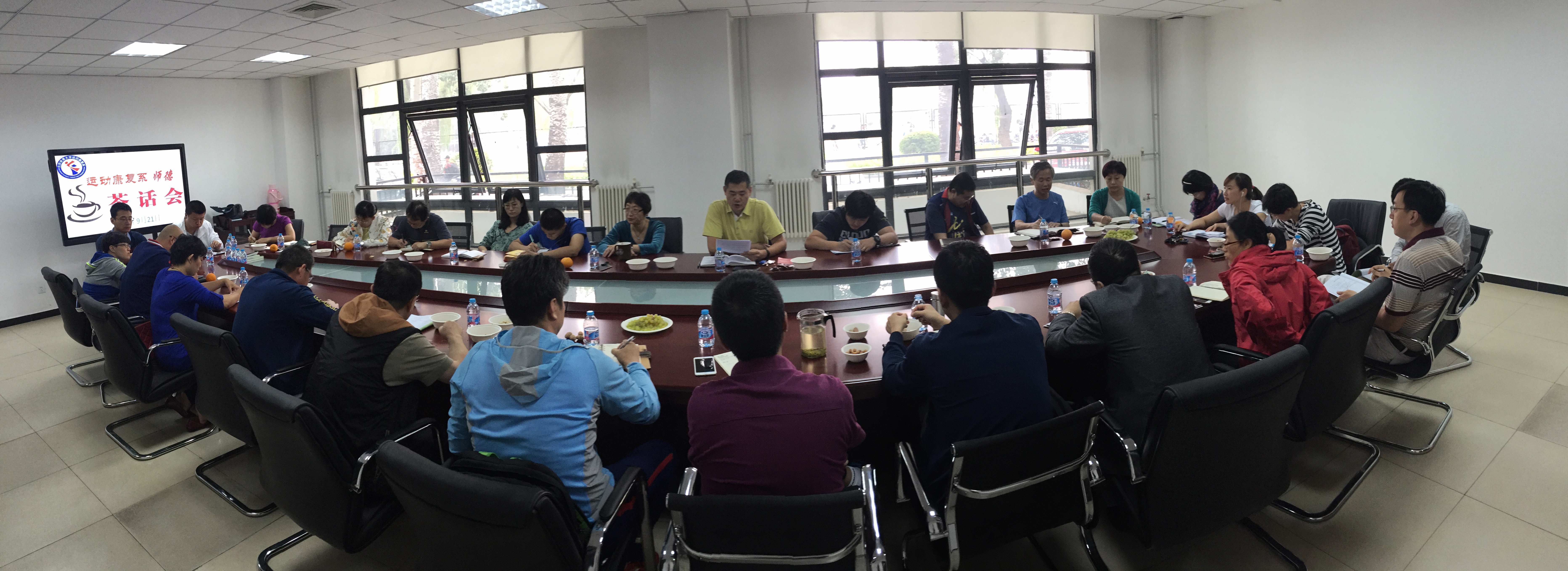 2016年9月21日上午10:00,运动康复系在英东田径场看台106会议室为庆祝第32个教师节,举行师德师风座谈会,我系全体教职工出席座谈会。