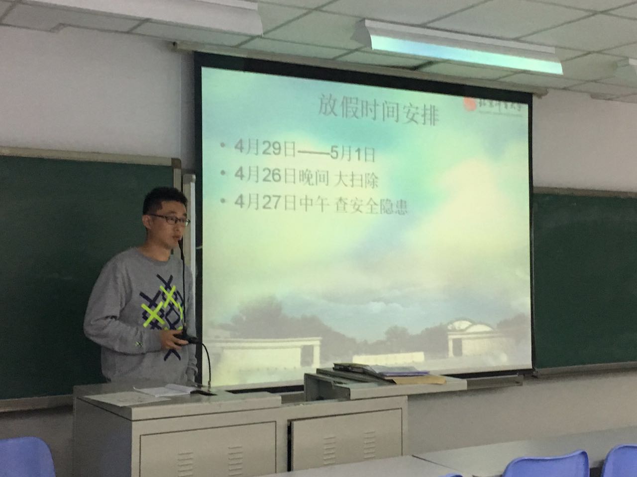 会议伊始,韩老师对五一假期相关事宜进行了安排,并强调在假期期间要注意宿舍安全,关好门窗,安全用电,遵守学校两禁要求。同时,韩老师也提醒外出游玩和回家的同学注意人身安全、饮食卫生等。紧接着,老师对半学期来实习工作做了简单的点评,对同学们认真严谨的工作态度提出表扬,并对下半年的实习变动进行了简单安排。最后,老师总结了校内开学以来的重大活动,肯定了我系同学们在校运会上的突出表现,也希望同学们在接下来的时间里能够继续保持良好积极状态,在学习生活中再接再厉!不断进步!