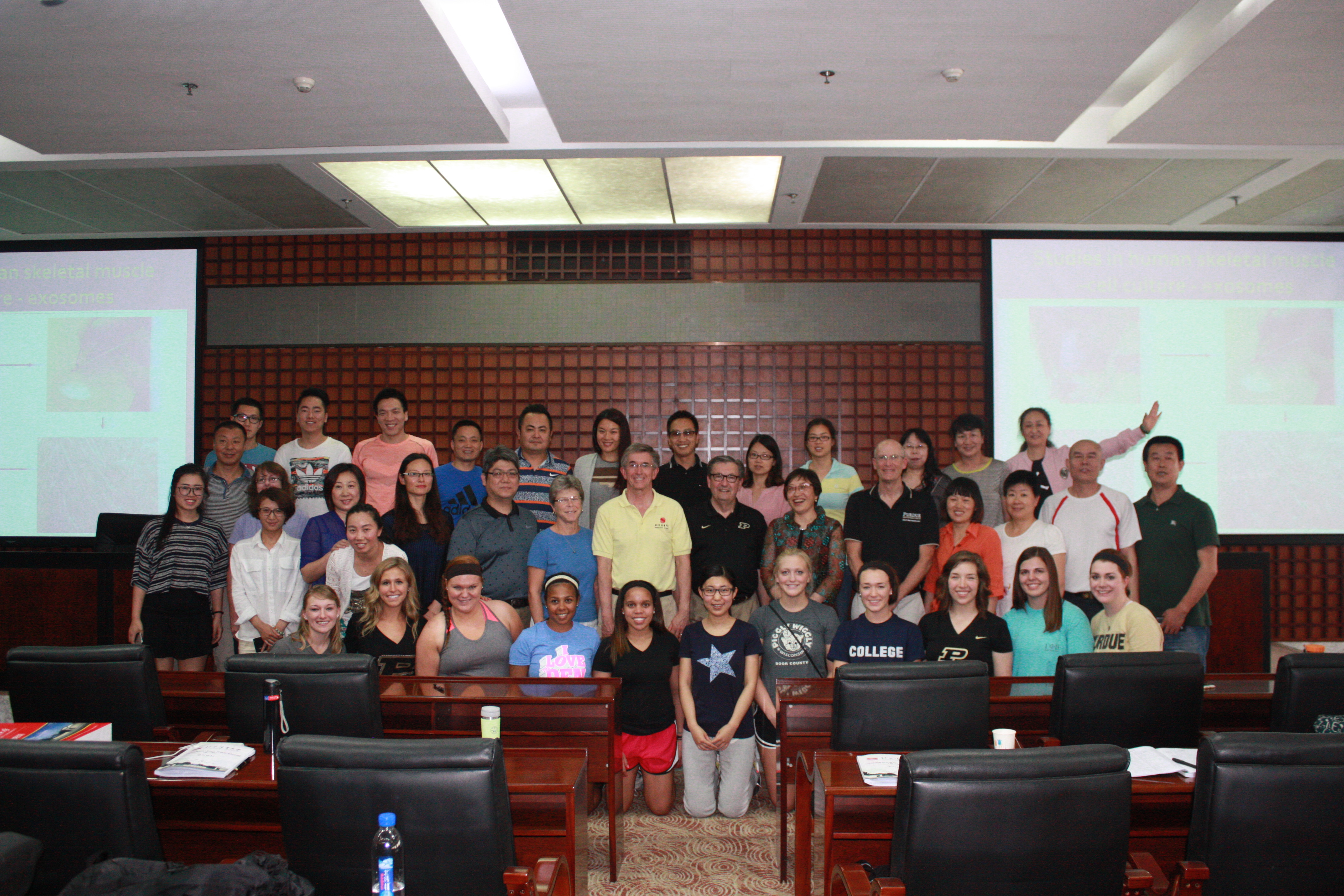 5月19日,《运动伤害防护基础》资质证书培训班开课第四天,正值美国普渡大学来公司进行学术交流,在运动康复系副主任矫玮教授的努力下,特意安排了交流团团长普渡大学运动康复学院经理拉维教授为学员们授课。拉维教授是现任世界康复协会主席,是世界著名的运动康复专家。能在培训中增加此次授课,学员们十分惊喜,各个聚精会神的听讲,生怕漏听了任何一句话。课后,普渡大学交流团的老师和职工与培训班学员合影留念。