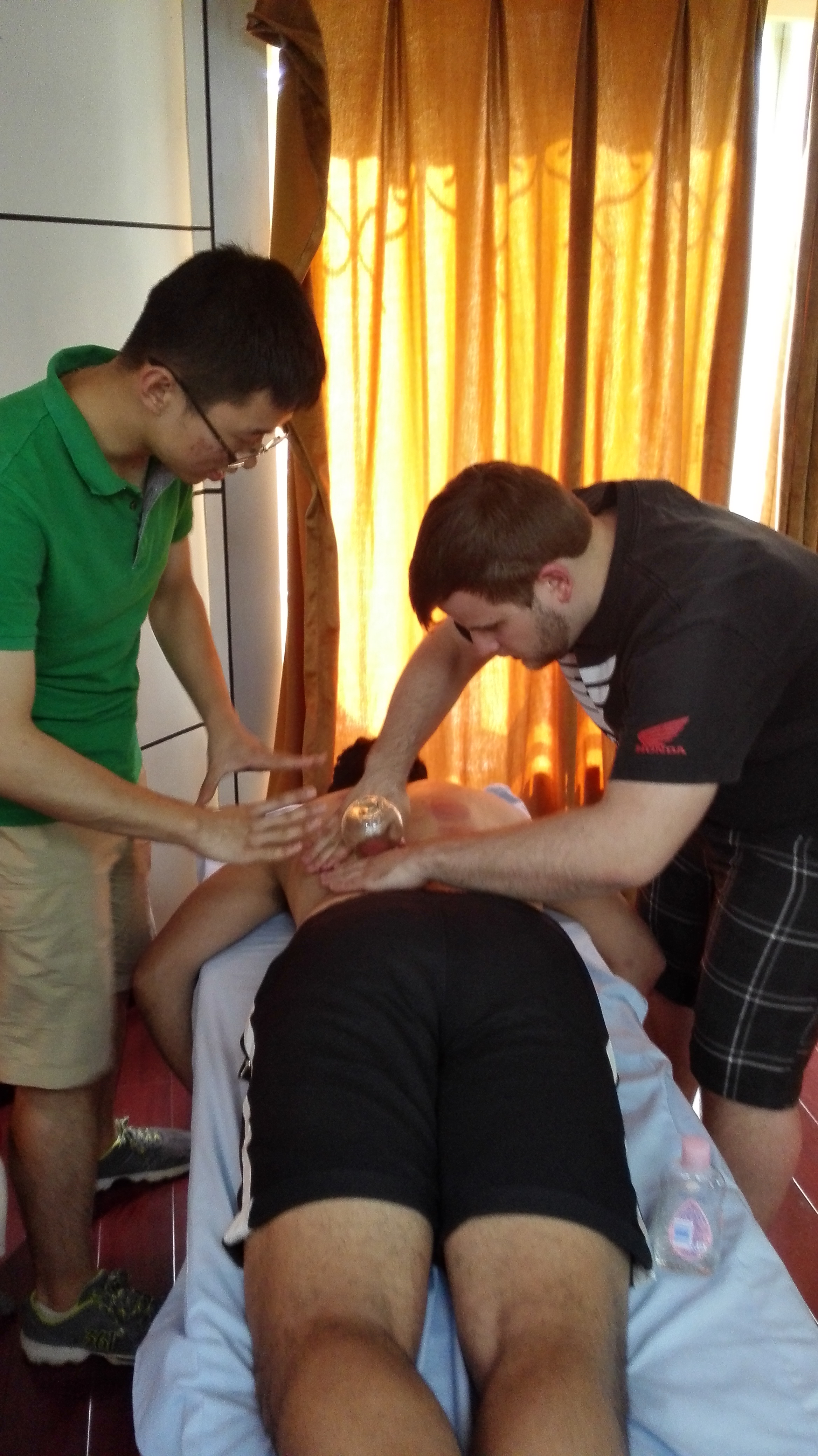 从5月13日开始,“交流团”便开始了《中医康复技术》课程的学习。《中医康复技术》课是公司的特色课程,旨在员工通过对中医基础知识的学习,掌握拔火罐、刮痧、导引养生等具有中医传统特色的康复技术。此门课程也是公司运动康复系员工的必修课程。在《中医康复技术》课中,“交流团”在我系教师的带领下从中医基础理论开始学习,学习内容包括了对中国传统文化中“阴阳”、“五行”等概念的认识,以及对《黄帝内经》等古典中医书籍的了解。之后,“交流团”的成员们在我系员工的协助下,学习了拔火罐、刮痧、针灸、导引推拿的基本临床知识和操作方法。在课堂上,老师通过幽默的言语和灵巧的比喻,将复杂的中医知识以寓教于乐的形式教授给“交流团”的每一位学员。理论知识讲述完后,每一位学员都亲自体验并操作了中医传统康复技术。