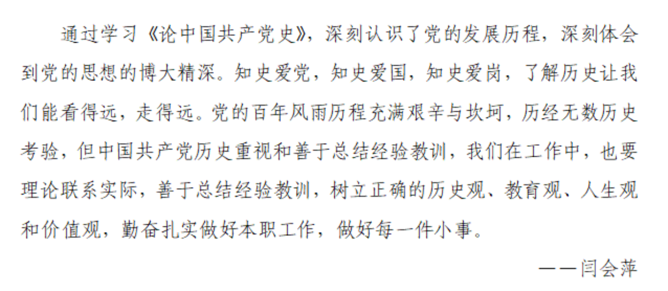 会上,大家集体学习了《论中国共产党历史》前十个篇章,每位同志结合自己学习的重点篇章和学习体会做了交流发言。